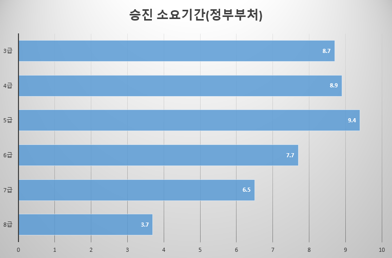 공무원의 평균승진 소요 기간은 9급에서 8급은 3년 7개월, 8급에서 7급은 6년 5개월, 7급에서 6급은 7년 7개월, 6급에서 5급은 9년 4개월, 5급에서 4급은 8년 9개월, 4급에서 3급은 8년 7개월이 평균적으로 소요되었습니다.