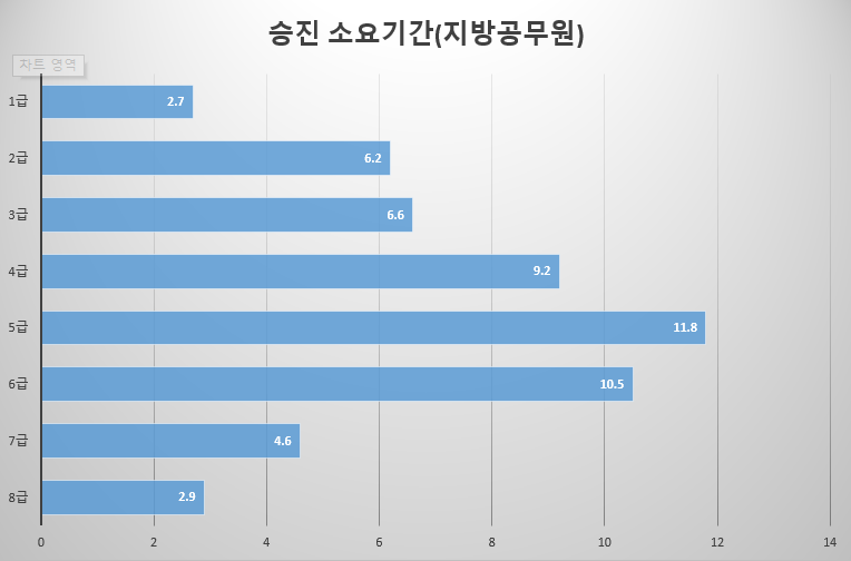 지방공무원의 평균승진 소요 기간은 9급에서 8급은 2년 9개월, 8급에서 7급은 4년 6개월, 7급에서 6급은 10년 5개월, 6급에서 5급은 11년 8개월, 5급에서 4급은 9년 2개월. 4급에서 3급은 6년 6개월, 3급에서 2급은 6년 2개월이 평균적으로 소요되었습니다.