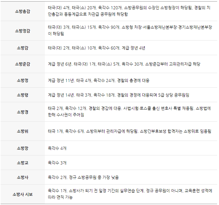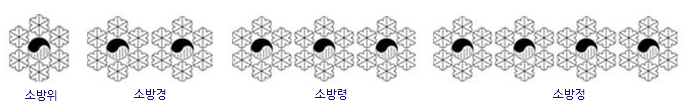 - 소방정 : 계급 정년 11년. 태극 4개, 육각수 24개. 경찰의 총경에 대응됩니다.