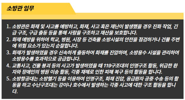 - 소방관은 화재 및 사고를 예방하고, 화재, 사고 혹은 재난이 발생했을 경우 진화 작업, 긴급 구조, 구급 출동 등을 통해 사람을 구조하고 재산을 보호합니다.
