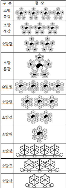 - 소방사시보 : 육각수 1개. 소방사가 되기 전 일정 기간의 실무연습 단계. 정규 공무원이 아니며, 교육훈련 성적에 따라 면직이 가능합니다.