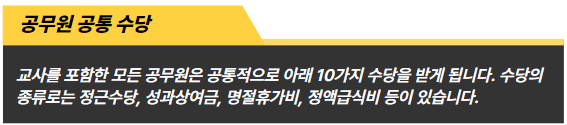 교사를 포함한 모든 공무원은 공통적으로 아래 10가지 수당을 받게 됩니다. 수당의 종류로는 정근수당, 성과상여금, 명절휴가비, 정액급식비 등이 있습니다.