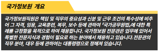 국가정보원직원은 책임 및 직무의 중요성과 신분 및 근무 조건의 특수성에 비추어 그 자격, 임용, 교육훈련, 복무, 보수 등에 관하여 「국가공무원법」에 대한 특례를 규정함을 목적으로 하여 채용합니다. 국가정보원 전문관은 업무에 있어서 특별한 전문지식과 경험이 필요로 하는 분야에서 채용하고 있습니다.전문관의 직무 분야, 대우 등에 관하여는 대통령령으로 정해져 있습니다.