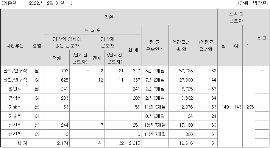 | 사업부문 | 성별 | 직원수 | 평균근속연수 | 평균연봉(백만) |