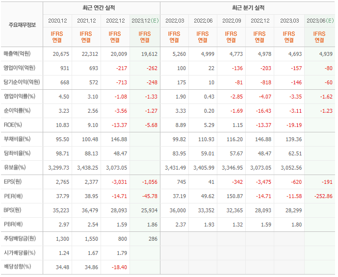 2022년 실적은 2조 9억, 영업이익은 -217억입니다. 그리고 영업이익률은 6.40%입니다.