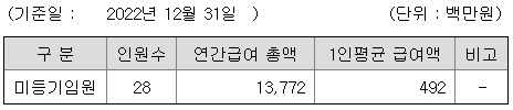 미등기임원의 평균연봉은 4억 9200만원이고 직원수는 28명입니다.