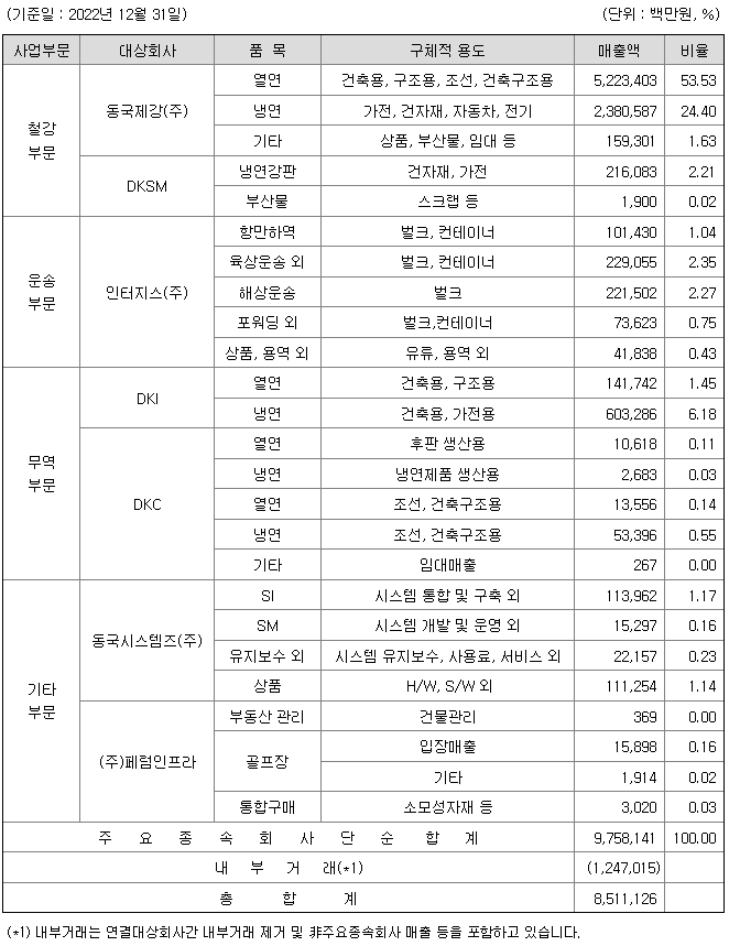 당사는 국내 최초로 15톤 교류 전기로를 시작으로 1990년대 초에는 직류 전기로를 도입, 양질의 형강과 철근의 대량 생산 등 현대식 전기로(爐) 시대를 열었습니다. 1971년 국내 최초로 후판 사업에 진출하면서 당사의 사업구조는 봉형강류(철근, 형강)와 판재류(후판)로 재편되었습니다. 2015년 1월 1일 유니온스틸(주)와의 합병으로 냉연강판 제조ㆍ판매업을 영위하게 되었으며 주력 제품은 철근, 후판, 형강, 냉연강판입니다.