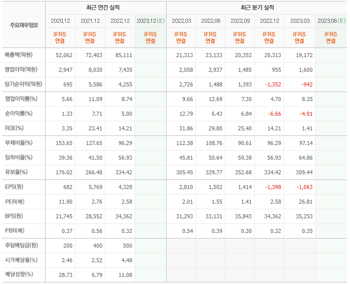 2022년 실적은 8조 5111억, 영업이익은 7435억입니다. 그리고 영업이익률은 6.40%입니다.