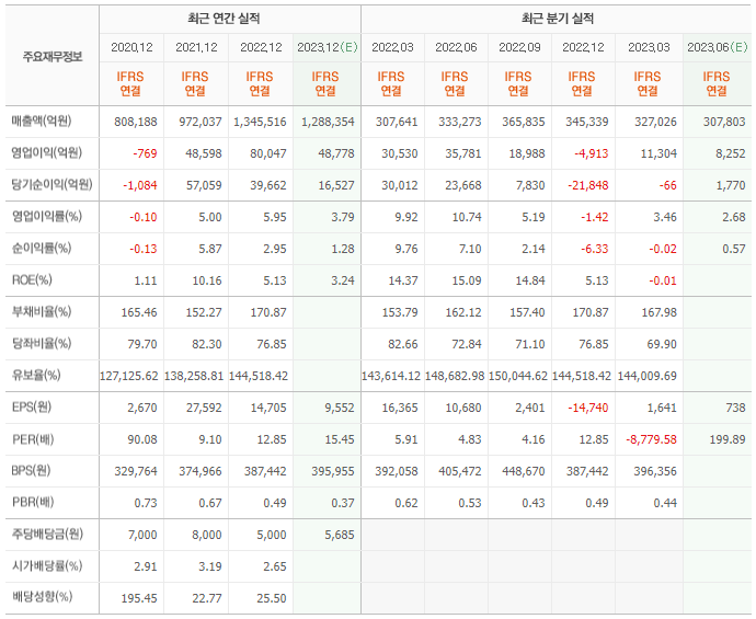2022년 실적은 134조 5516억, 영업이익은 8조 47억입니다. 그리고 영업이익률은 5.95%입니다.