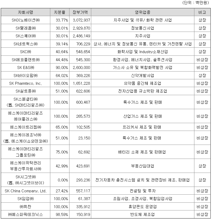 당사 투자부문은 지주회사로서 에너지·화학, 정보통신·소재, 물류·서비스 등 사업분야의 종속회사 지분을 보유하며, 4대 핵심사업 중심의 투자전문 사업을 영위하고 있습니다. 당사는 2021년 12월 舊, SK머티리얼즈주식회사의 지주사업 부문을 흡수합병하여, 투자부문 내 소재분야 전문 사업개발 및 BM 혁신을 주축으로 하는 MR CIC 조직을 운영하고 있습니다.