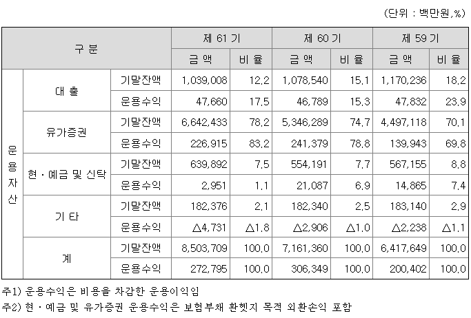 보험영업에서는 종목별, 지역별 분산 및 수익성 중심의 포트폴리오 구축을 통해 자연재해 및 대형사고 등의 위험에도 불구하고 안정적인 이익 시현을 추구하고 있고, 투자영업에서는 지속적인 포트폴리오 다변화 등 자본차익 기회를 확보하기 위한 자산 배분을 지향하며 안정적이고 지속적인 수익성을 위해 최선을 다하고 있습니다.