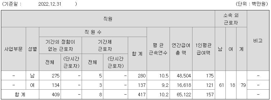 | 사업부문 | 성별 | 직원수 | 평균근속연수 | 평균연봉(백만) |