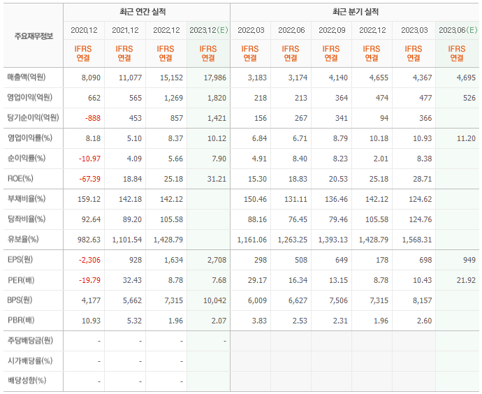 2022년 실적은 1조 5152억, 영업이익은 1269억입니다. 그리고 영업이익률은 6.40%입니다.