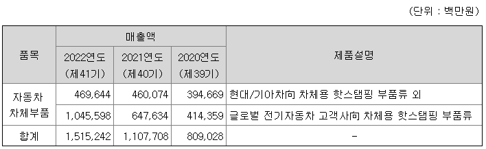 당사는 핫스탬핑 부품의 제조 및 판매를 주요사업으로 영위하고 있습니다. 판매활동은 완성차 업체를 대상으로 이루어집니다. 완성차 업체의 신규 차종 출시 일정에 맞추어 부품을 공급할 부품사를 대상으로 공개입찰을 실시하며 해당 입찰에서 성공할 경우 당사가 대상 차종에 적용되는 핫스탬핑 부품을 수주하는 형태입니다. 각 완성차 업체별 매출액은 다음과 같습니다.