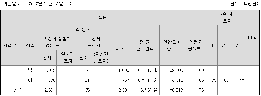 사업부문 성별 직원수 평균근속연수 평균연봉(백만)