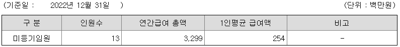 미등기임원의 평균연봉은 2억 5400만원이고 직원수는 13명입니다.