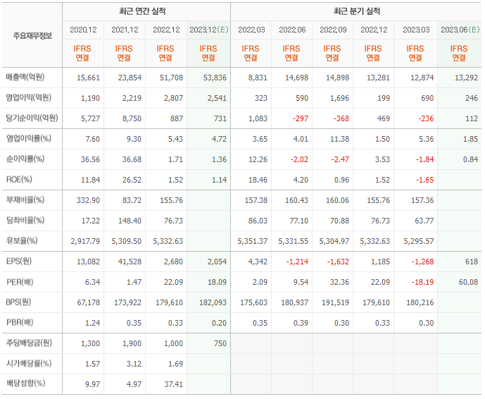 2022년 실적은 5조 1708억, 영업이익은 2807억입니다. 그리고 영업이익률은 5.43%입니다.