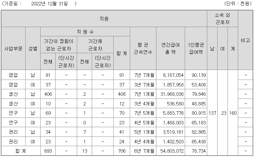 | 사업부문 | 성별 | 직원수 | 평균근속연수 | 평균연봉(백만) |