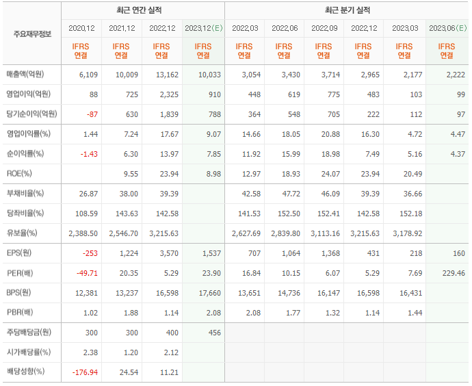 2022년 실적은 1조 3162억, 영업이익은 2325억입니다. 그리고 영업이익률은 17.67%입니다.