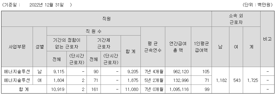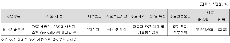 당사는 현재 EV, ESS, IT기기, 전동공구, LEV 등에 적용되는 전지 관련 제품의 연구, 개발, 제조, 판매하는 사업을 영위하고 있으며 에너지솔루션 단일 사업부문으로 구성되어 있습니다. 2022년 연간 기준으로 약 25조 5,986억원의 매출과 약 1조 2,137억원의 영업이익을 달성하였습니다.