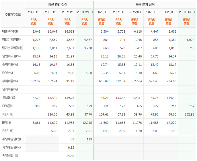 2022년 실적은 1조 6058억, 영업이익은 3532억입니다. 그리고 영업이익률은 21.99%입니다.