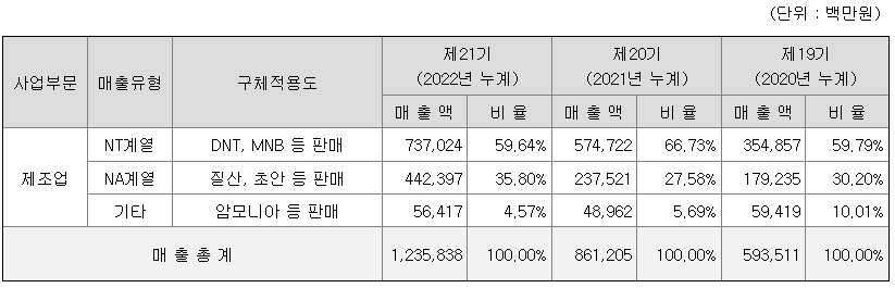 당사는 폴리우레탄 중간소재인 NT계열의 MNB, DNT와 NA계열의 희질산, 농질산, 초안 등을 생산하고 있습니다. 그 외에도 기초화학 상품 및 온실가스 저감 실적을 UN으로 부터 인증 받아 확보한 탄소배출권을 판매하고 있습니다.