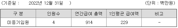 미등기임원의 평균연봉은 2억 2900만원이고 직원수는 4명입니다.