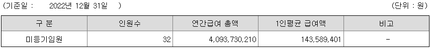미등기임원의 평균연봉은 1억 4300만원이고 직원수는 32명입니다.