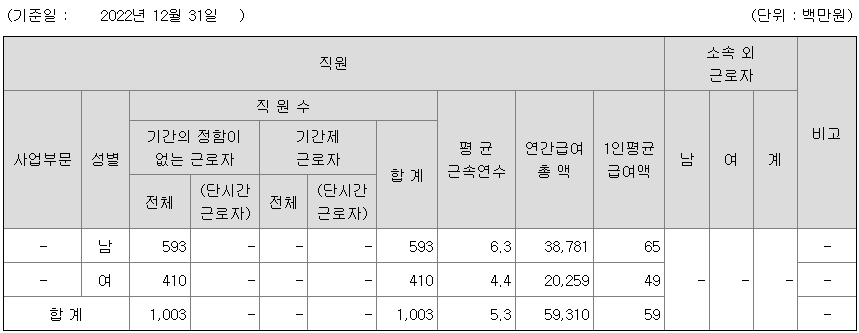 | 사업부문 | 성별 | 직원수 | 평균근속연수 | 평균연봉(백만) |