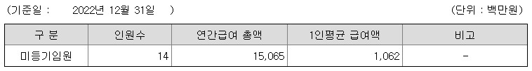 미등기임원의 평균연봉은 10억 6200만원이고 직원수는 14명입니다.