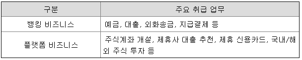 당사의 영업은 크게 뱅킹 비즈니스 부문과 플랫폼 비즈니스 부문으로 구분할 수 있습니다. 당사는 인터넷전문은행으로서 기본적인 여수신 상품을 포함한 은행업 상품 및 서비스를 제공하는 한편, 모바일 앱 기반의 디지털 플랫폼 사업자로서 금융업 뿐 아니라 비금융업 전반에 걸친 여러 파트너사들과 제휴하여 금융과 생활의 영역에서 고객들에게 다각적인 서비스를 제공하고 있습니다.