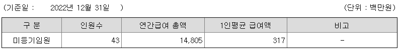 미등기임원의 평균연봉은 3억 1700만원이고 직원수는 43명입니다.