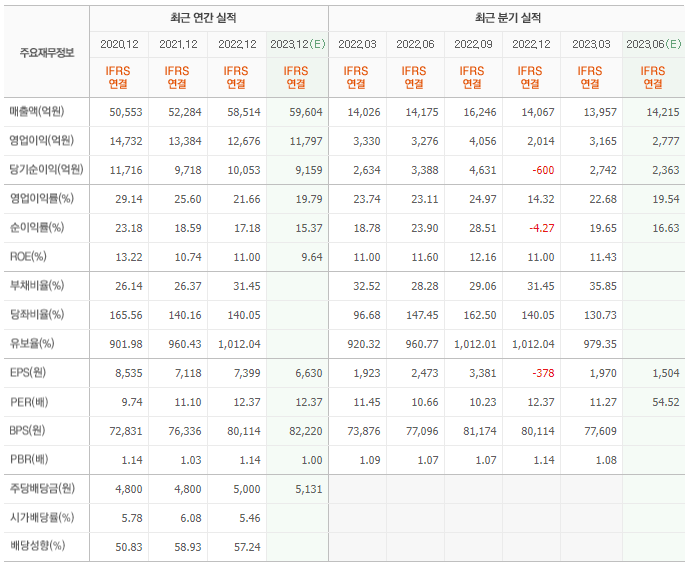 2022년 실적은 5조 8514억, 영업이익은 1조 2676억입니다. 그리고 영업이익률은 21.66%입니다.