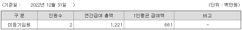 미등기임원의 평균연봉은 6억 6100만원이고 직원수는 2명입니다.