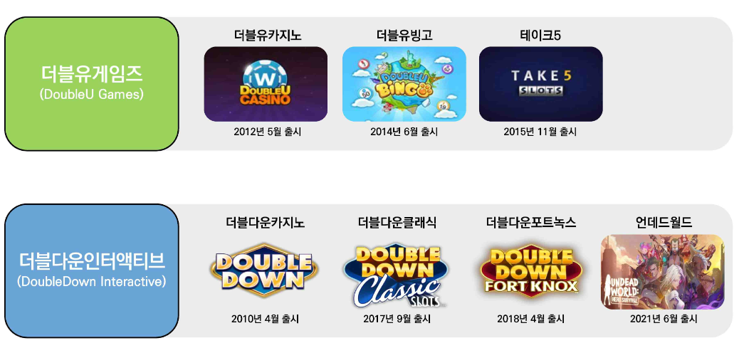 당사는 더블유카지노(DoubleU Casino), 더블유빙고(DoubleU Bingo), 테이크5(Take5) 등 4가지 모바일 게임을 서비스 하고 있으며, 당사의 종속회사인 더블다운인터액티브는 더블다운카지노(DoubleDown Casino), 더블다운포트녹스(DoubleDown FortKnox), 언데드월드(Undead World: Hero Survival) 등 4가지 게임을 서비스하고 있습니다.
