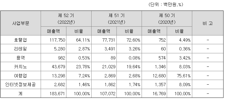 한편, 당사의 종속회사인 (주)엘티엔터테인먼트는 엘티카지노(외국인전용카지노)의 영업장 소재지를 기존 롯데호텔제주에서 제주 드림타워 복합리조트로 이전하고, 영업장 면적을 기존의 1,176㎡에서 5,367㎡로 확장하기 위하여 2021년 1월 29일 '엘티카지노의 영업장 소재지 및 면적 변경 허가'를 제주특별자치도에 신청하였으며, 2021년 4월 8일 변경 허가를 득하였습니다. 이에 따라 엘티카지노를 제주 드림타워 복합리조트로 확장 이전하여 2021년 6월 11일 개장하였습니다. 참고로 당사는 2014년 정관 개정을 통해 카지노업을 사업목적으로 추가하였으며, 2018년 8월 17일 파라다이스그룹이 제주 롯데호텔에서 운영중이던 '파라다이스 제주롯데 카지노(주식회사 두성)'를 주식양수도계약을 통해 149억원에 인수한 후, 상호를 '엘티카지노(주식회사 엘티엔터테인먼트)' 로 변경하고 350억원 유상증자에 참여하여 엘티카지노의 재무구조를 개선함으로써 카지노사업 진출의 기반을 마련하였습니다.