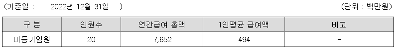미등기임원의 평균연봉은 4억 9400만원이고 직원수는 20명입니다.