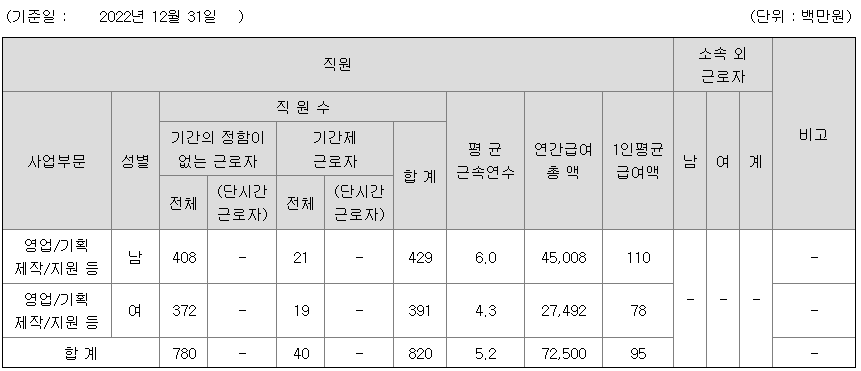 남성의 평균연봉은 1억 1000만원이고 직원수는 429명, 여성은 7800만원이고 직원수는 391명입니다. 전체 평균연봉은 9500만원이고 직원수는 820명입니다.