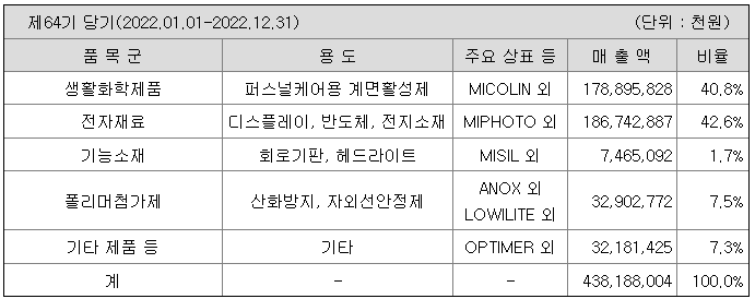 각 분야의 주요 생산품목은 계면활성제, 전자재료, 자외선안정제, 산화방지제, 고무첨가제 등 고부가가치 첨단 정밀화학제품이며, 제64기 당기말 연결기준 매출액은 438,188백만원입니다. 주요 제품의 가격은 원재료 가격 및 시장 수급상황에 따라 변동하며, 제품 판매 단가는 생활화학재료 2,542원/kg, 전자재료 60,894원/kg, 기능소재 26,973원/kg입니다. (가격 산출 방법은 당사 생산 제품의 공시대상기간 단순평균 판매 금액임.)