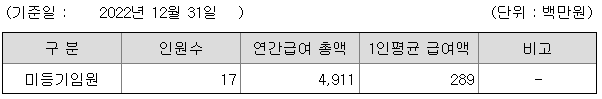 미등기임원의 평균연봉은 2억 8900만원이고 직원수는 17명입니다.
