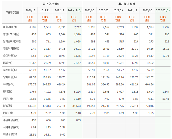 2022년 실적은 8394억, 영업이익은 2044억입니다. 그리고 영업이익률은 24.35%입니다.