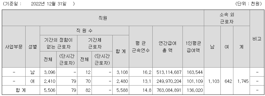 | 사업부문 | 성별 | 직원수 | 평균근속연수 | 평균연봉(백만) |