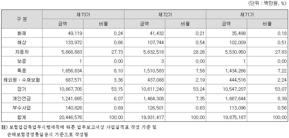 삼성화재해상보험(주)와 그 종속회사가 영위하는 사업은 국내외 손해보험업(국내보험업은 손해보험사가 영위할 수 있는 모든 사업, 해외 손해보험은 해당 국가 보험업 규제에 따른 허용사업)과 관련 규정에 의해 허용된 기타 국내 보험 관련 사업입니다. 국내 보험사업은 지배회사가 영위하고 있으며, 해외 보험사업은 각 국가별로 규제가 상이하여 이에 부합하는 형태의 종속회사를 설립하여 운영하고 있습니다. 기타 국내보험 관련 사업은 손해사정서비스, 고객상담 및 출동서비스, 보험대리점 등으로 고객서비스 차별화, 업무 전문성 확보 및 비용절감 등을 목적으로 설립된 전략적 사업단위입니다.