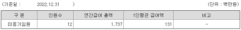 미등기임원의 평균연봉은 1억 3100만원이고 직원수는 12명입니다.