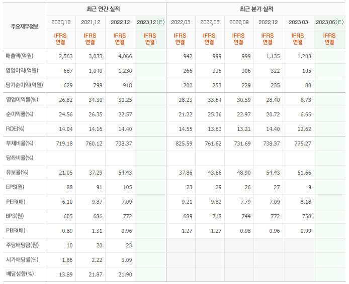 2022년 실적은 4066억, 영업이익은 1230억입니다. 그리고 영업이익률은 24.35%입니다.