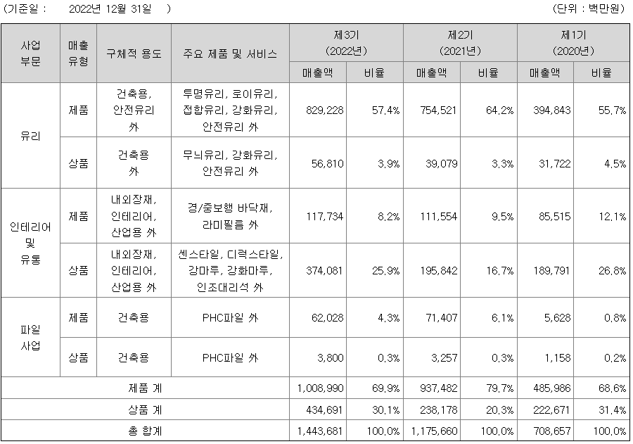 유리는 크게 건축용과 자동차용으로 구분되며 건축용 유리는 당사의 주력 제품입니다. 기존 유리 기술보다 기술적으로 진보된 고부가가치 유리인 코팅 유리(판유리 표면에 물질을 코팅한 고부가가치 유리)는 건축물에너지 저감정책에 따라 점진적으로 수요가 증가되고 있는 로이유리(Low-E유리: 유리 표면에 금속 또는 금속산화물을 얇게 코팅하여 열의 이동을 최소화 시켜주는 에너지 절약형 유리)나 건축물 외관에 다양한 색상을 부여할 수 있는 반사유리 등의 형태로 생산돼 다양한 고객의 요구에 맞춘 고품질 유리를 공급하고 있습니다.