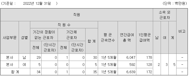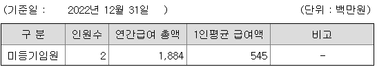 미등기임원의 평균연봉은 5억 4500만원이고 직원수는 2명입니다.