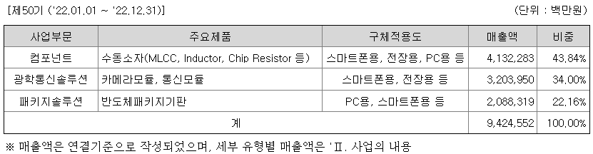 2022년말 누적 매출액은 전년 동기 대비 2.6% 하락한 9조 4,246억원으로, 각 사업부문별 매출액 및 매출비중은 컴포넌트 사업부문 4조 1,323억원 (43.84%), 광학통신솔루션 사업부문 3조 2,040억원(34.00%), 패키지솔루션 사업부문 2조 883억원(22.16%)입니다. 매출 유형별 매출실적은 제품/상품 9조 2,737억원, 용역 및 기타매출 1,509억원으로 구성되어 있습니다. 당사의 주요 매출처는 삼성전자와 그 종속기업이며, 주요 매출처에 대한 매출비중은 전체 매출액 대비 약 32.3% 수준 입니다.