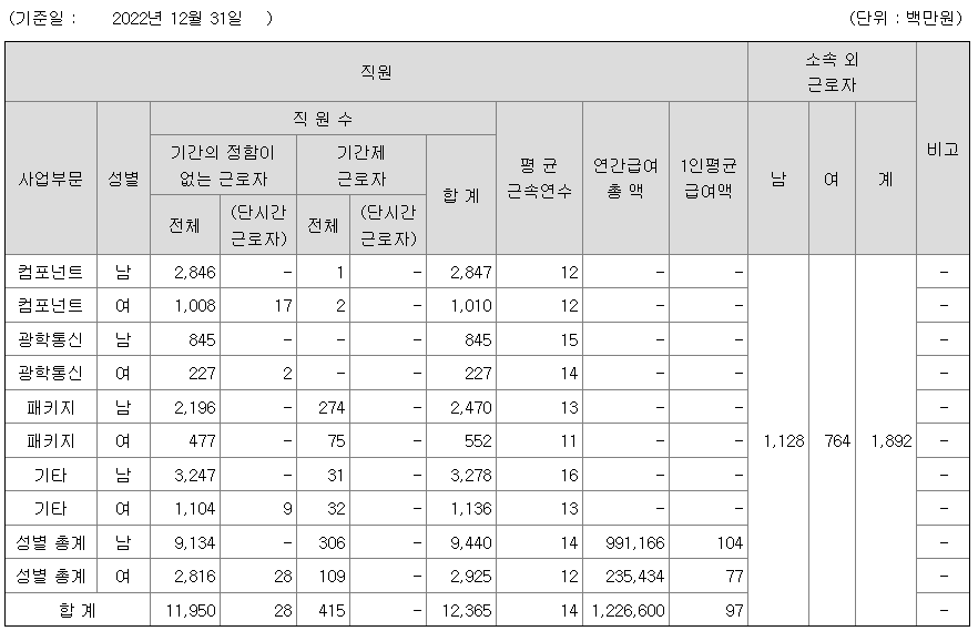 | 사업부문 | 성별 | 직원수 | 평균근속연수 | 평균연봉(백만) |