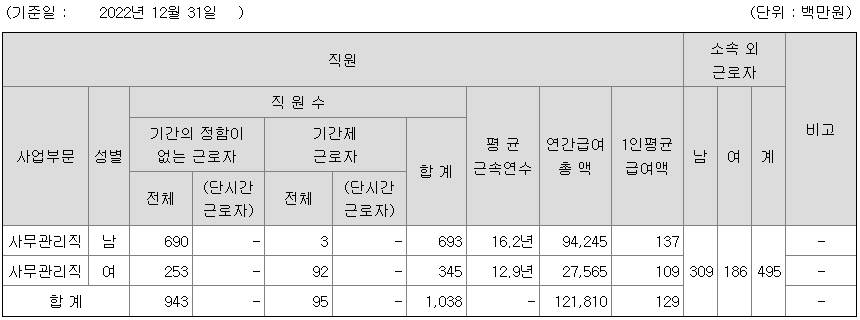 | 사업부문 | 성별 | 직원수 | 평균근속연수 | 평균연봉(백만) |